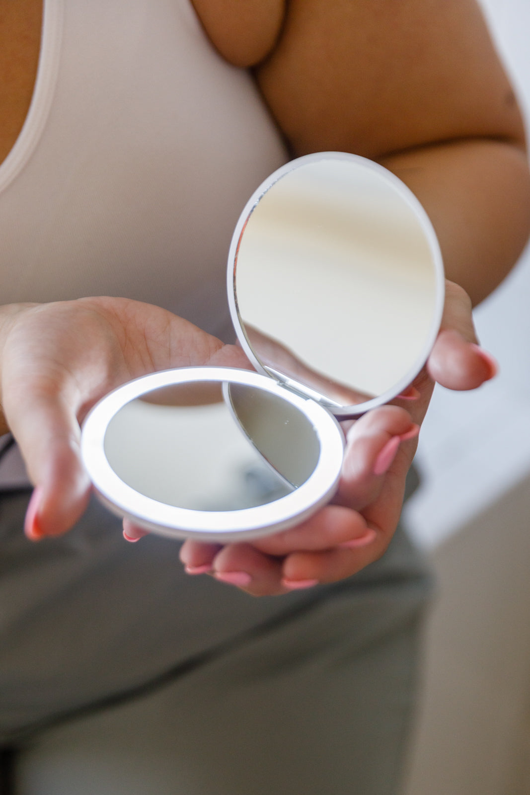 The Double Take LED Compact Mirror might just become your new favorite item in your handbag! Unlock the secrets of elegance with the gentle touch of a button, revealing a captivating glow that emanates from its sleek LED frame. With its ingenious dual-view design, you'll have two mirrors at your disposal - one with a magnifying power that reveals even the tiniest of details, and the other with a classic reflection, offering a full view of your radiant charm.