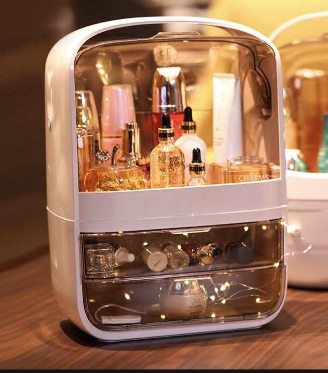 Available in pink, white and sage green, this portable cosmetic storage case is beautiful and functional! With a large capacity upper section and two functional drawers, the sturdy clear acrylic allows you to see exactly where all of your products are!