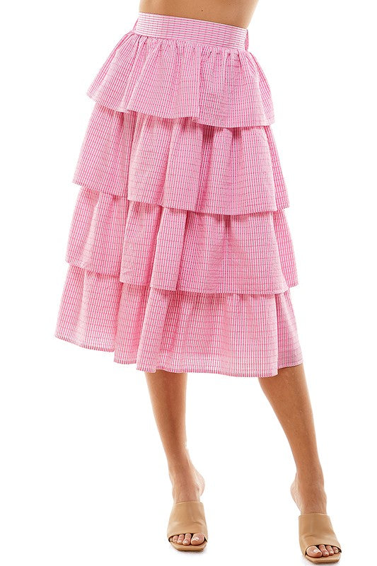 Tiered midi skirt, with ruffle design, high waist fit, and elastic waistband on back for a comfortable fit. Model Size + Fit: Model height: 5'9" Dress size: 2 Bust: 33 Waist: 25 Hips: 34