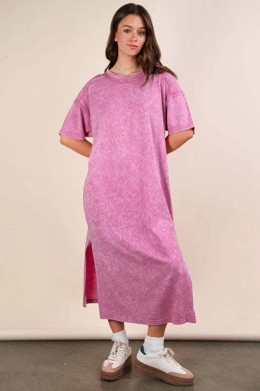 A mineral washed casual comfy midi dress is perfect for relaxed, everyday wear. The mineral wash gives it a unique, slightly faded look. This versatile dress can be dressed up with accessories or styled casually for a comfortable outfit.